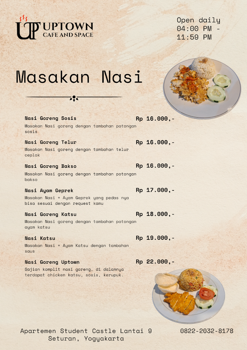 Welcome to Uptown Cafe and Space, an exquisite gem nestled in Caturtunggal, Depok, Yogyakarta. This vibrant cafe is not just a place to sip coffee; it’s an experience for the senses. The menu boasts a delectable array of dishes that blend local flavors with international influences, all at affordable prices.